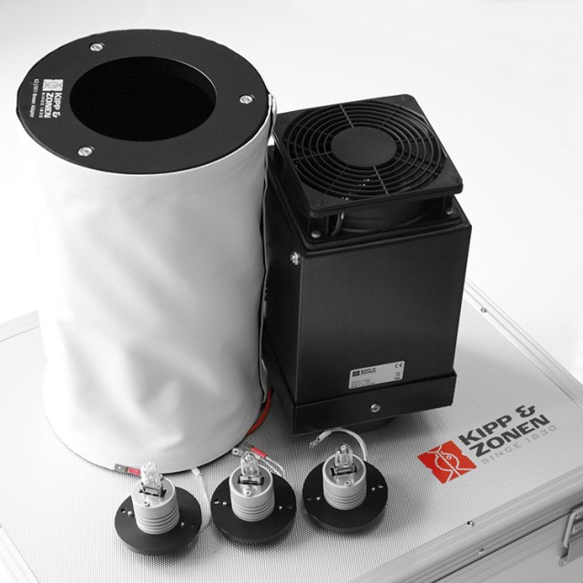 Un attrezzo distanziale dotato di tendina garantisce che la lampada di calibrazione sia posta alla distanza corretta dall'ottica del Brewer; un alimentatore da tavolo con tastiera e schermo fornisce un voltaggio DC molto stabile alla lampada, permettendo la programmazione dei tempi di rampa e raffreddamento.